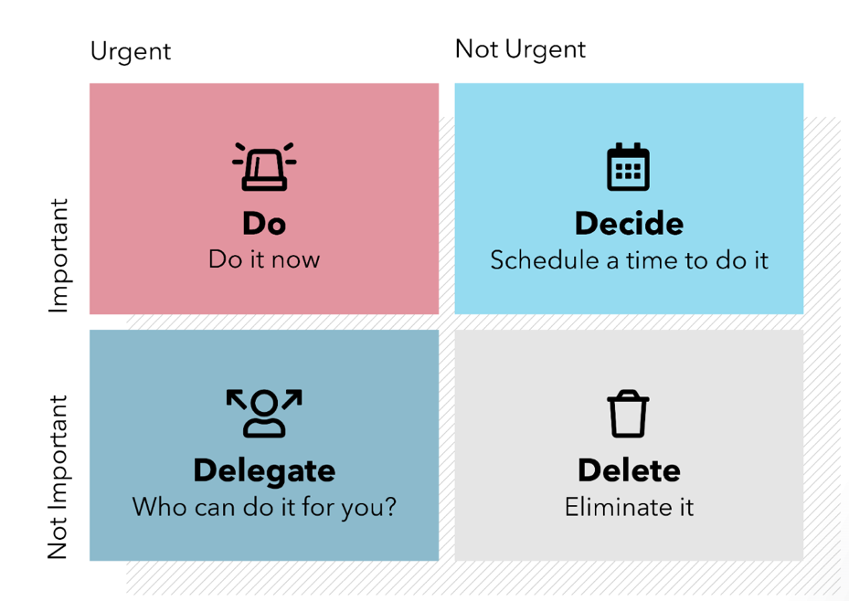 The first step, and most important step, is to identify what are the highest priority items. One easy way to visualize this is using the Eisenhower matrix. This matrix is named after the U.S.’s 34th President, Dwight D. Eisenhower, who invented this method to focus on his most important tasks.